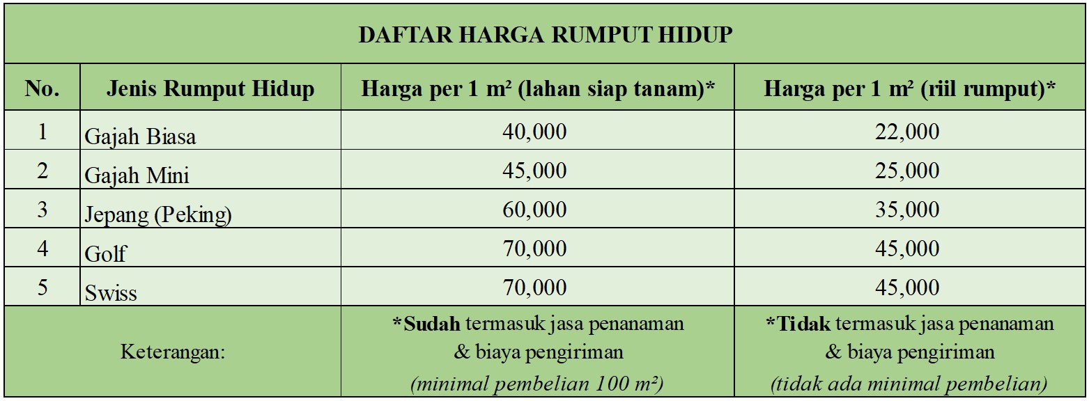 Harga menyesuaikan dengan jenis tanaman yang ingin digunakan serta kondisi lahan tanam (akan dilakukan survey lapangan terlebih dahulu (gratis) kemudian pengajuan/penawaran harga kepada calon konsumen).
